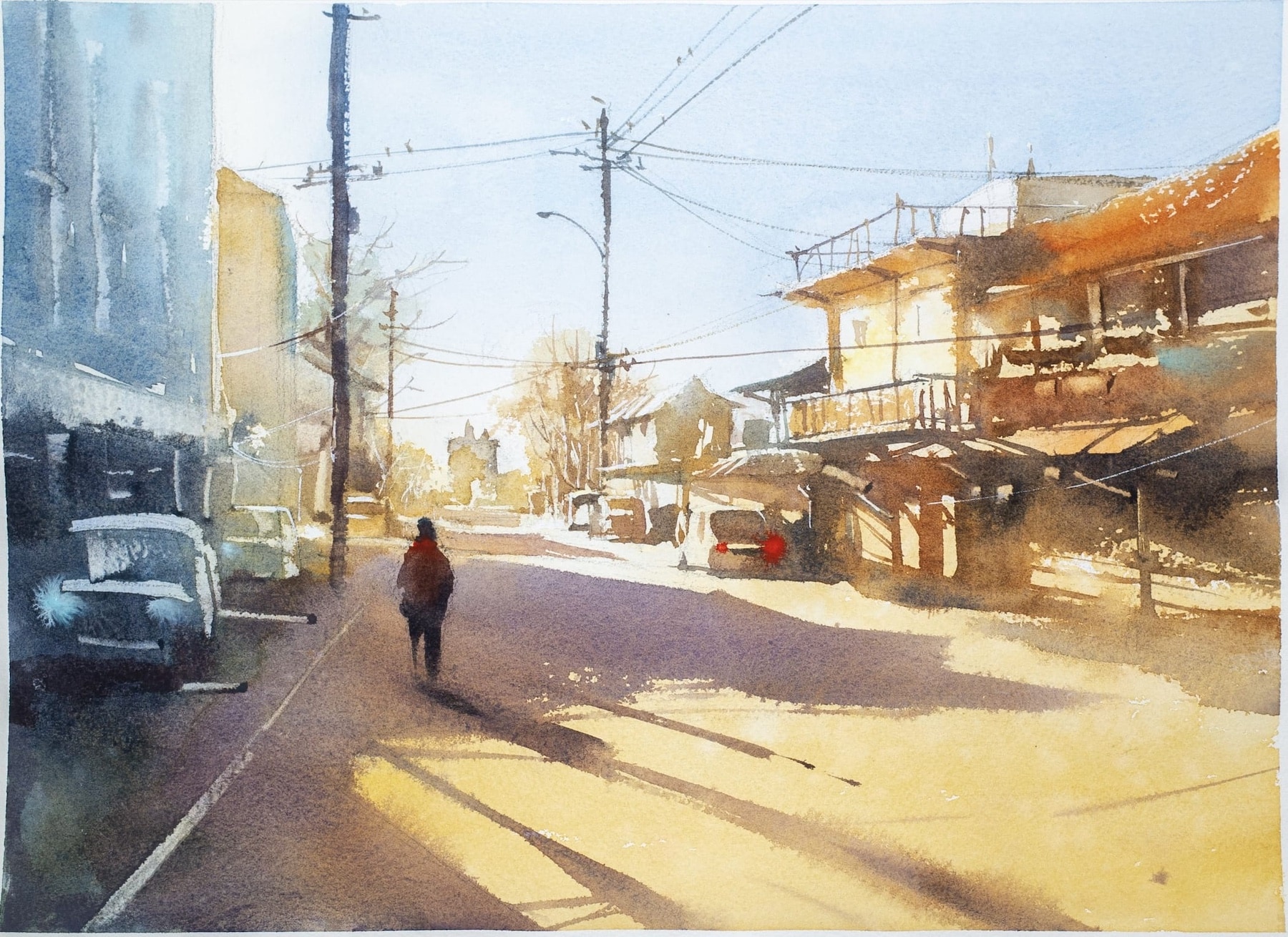2026-03-08 : 當年疫情時期常常會看Youtube 找風景來練習水彩,這張的表現方式也是藉由寒暖對比來表現出強烈的光線感。